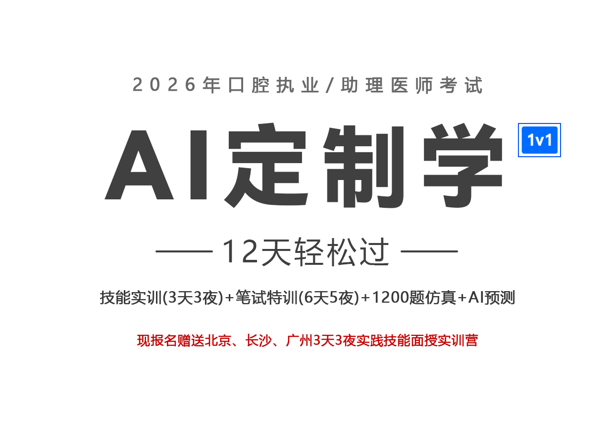 课程为AI定制,包含实践技能实训营、笔试特训、1200题仿真以及AI预测,现报名赠送北京、长沙、广州3天3夜实践技能面授实训营。